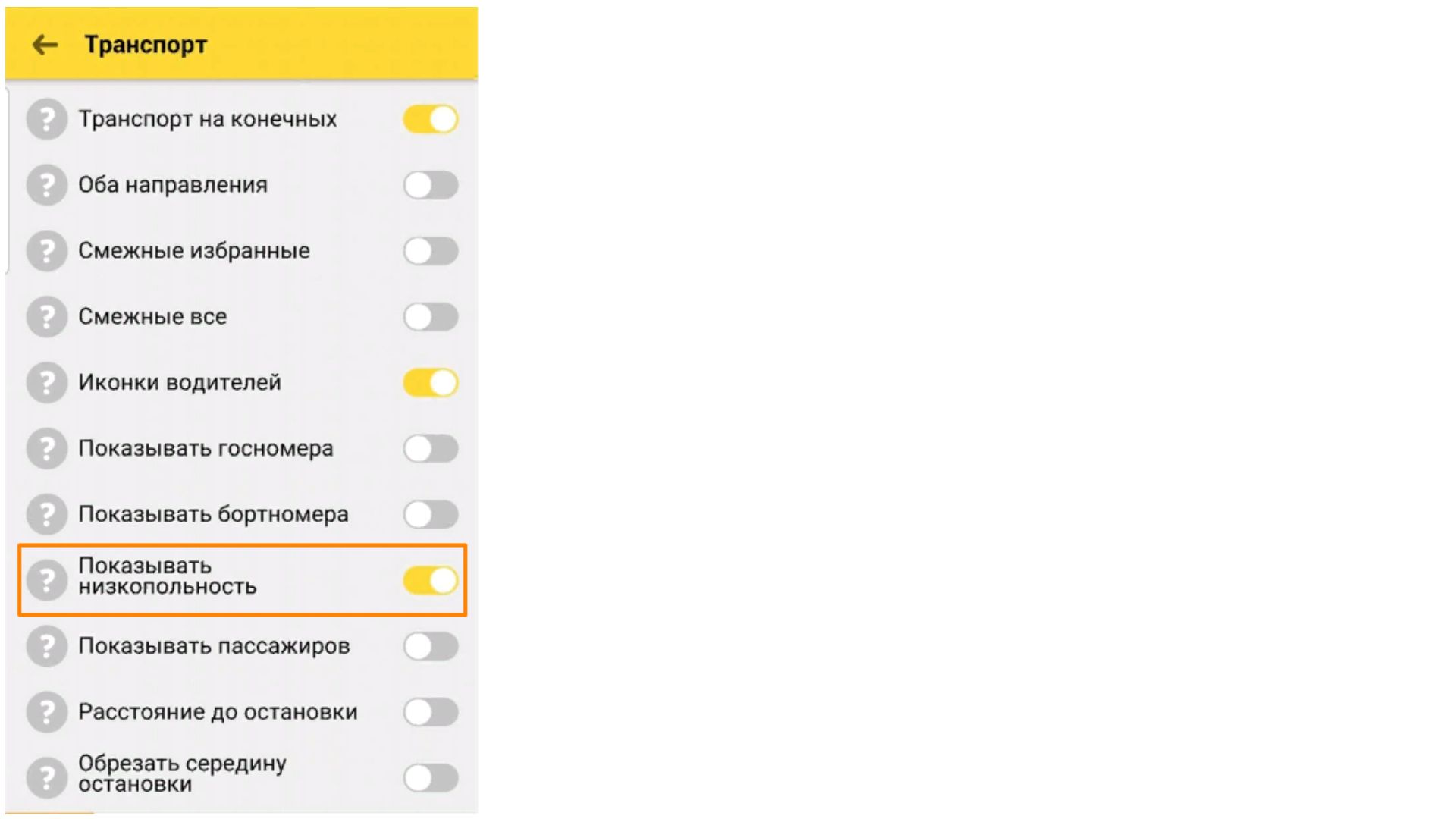 В настройках в разделе “Транспорт” можно включить функцию “Показывать низкопольность”. Тем самым при выборе автобуса будет виден знак “Инвалид”, что означет доступность транспорта для маломобильных граждан.