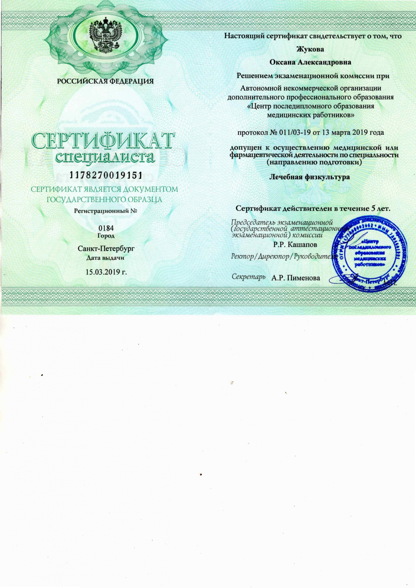С клиентом работает инструктор по лечебной физкультуре. Специализация – лечебная физкультура, квалификация – инструктор по лечебной физкультуре. Опыт работы – 6 лет