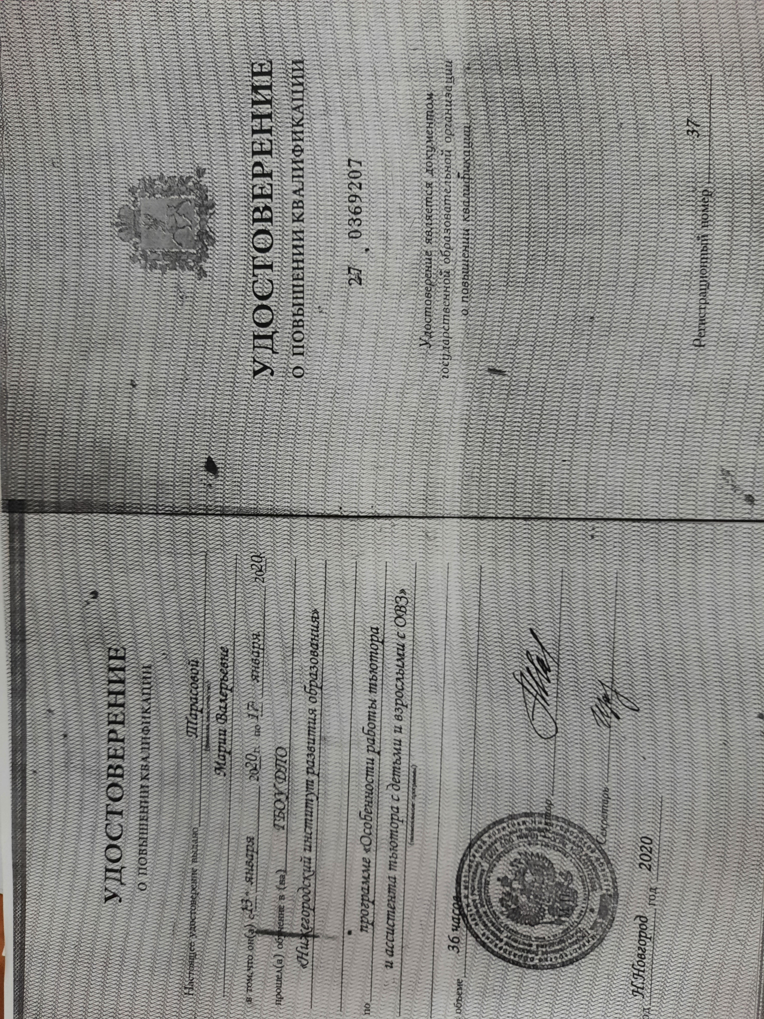 воспитатель группы компенсирующей направленности, квалификация "Педагог дошкольного образования", проф.деятельность "Педагогика и методика дошкольного образования в рамках реализации ФГОС" стаж работы 1 год