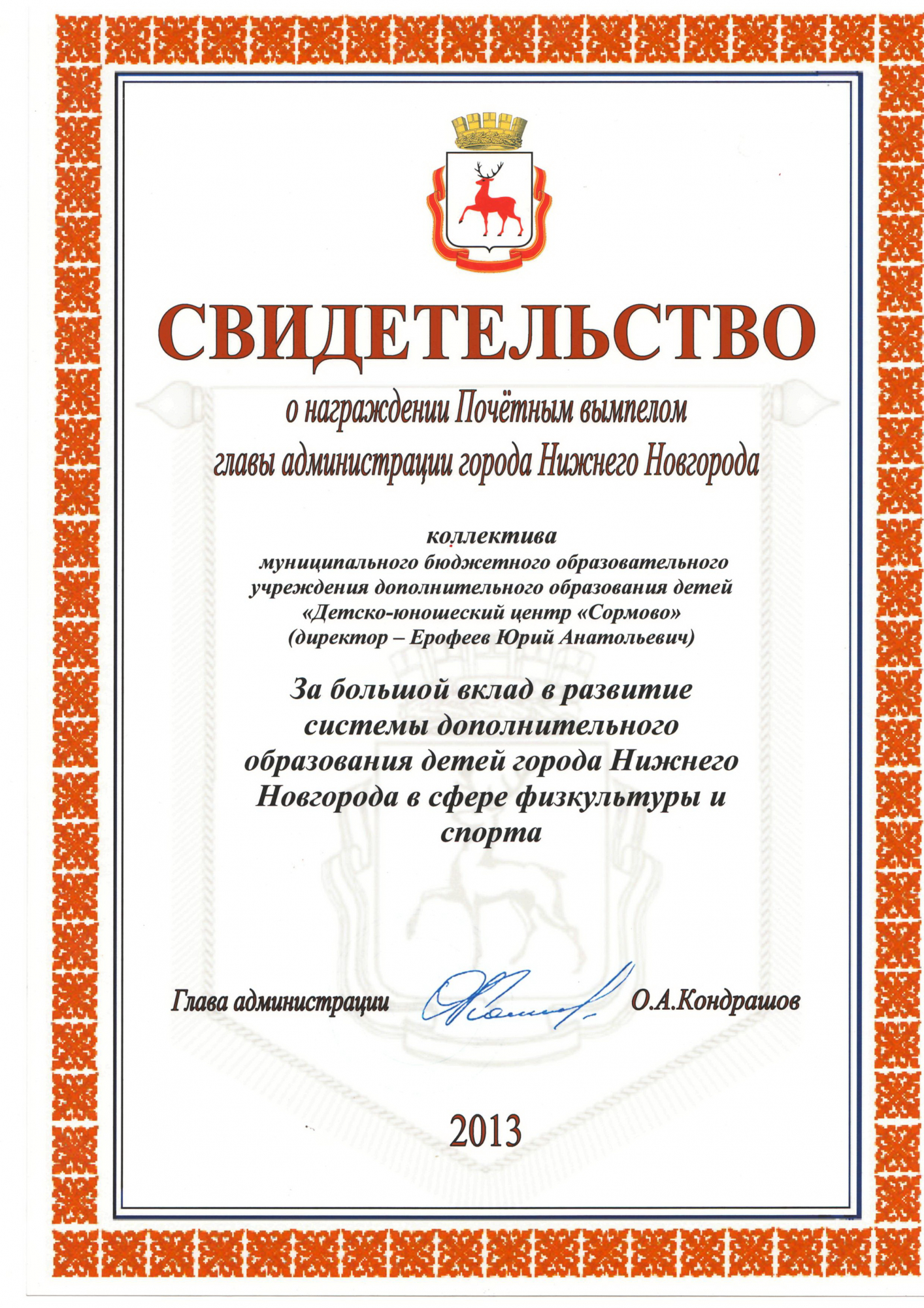 - Свидетельство о награждении Почетным вымпелом главы администрации г. Н.Новгорода за 2013год,