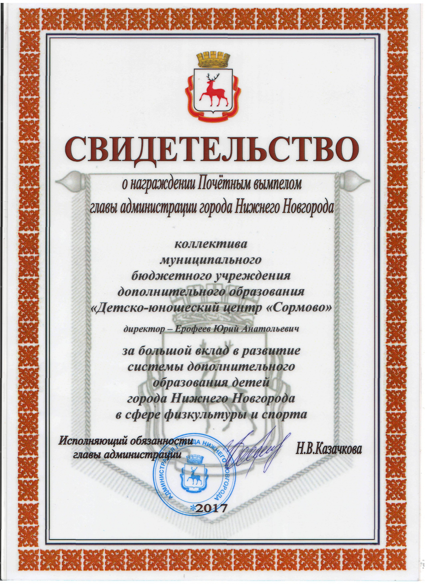 - Свидетельство о награждении Почетным вымпелом главы администрации г. Н.Новгорода за 2017 год,