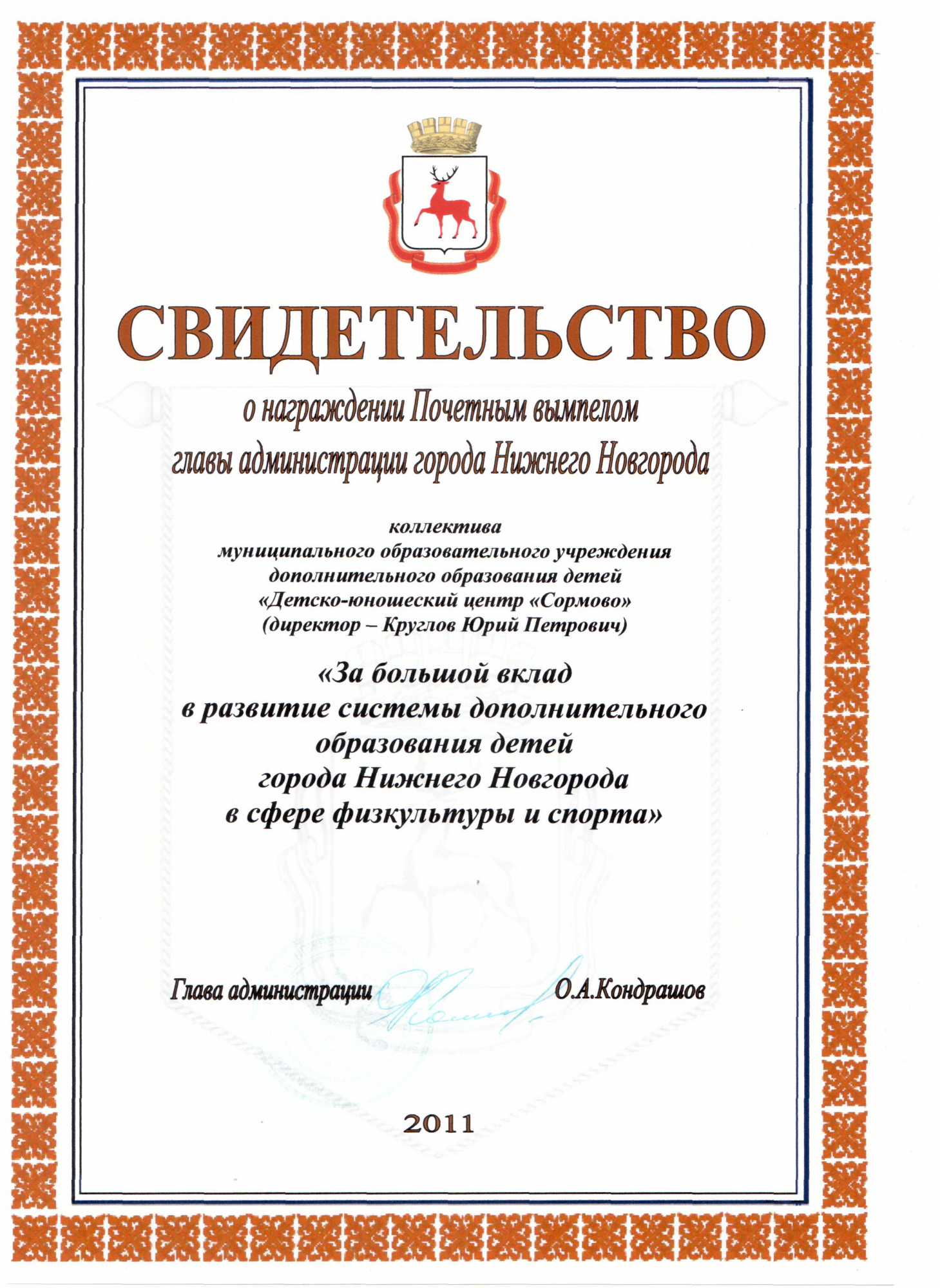 - Свидетельство о награждении Почетным вымпелом главы администрации г. Н.Новгорода за 2011 год,