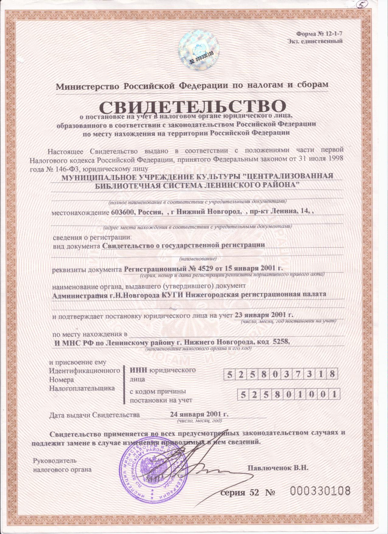 - Свидетельство о постановке на учет в налоговом органе юридического лица, образованного в соответствии с законодательством Российской Федерации по месту нахождения на территории Российской Федерации