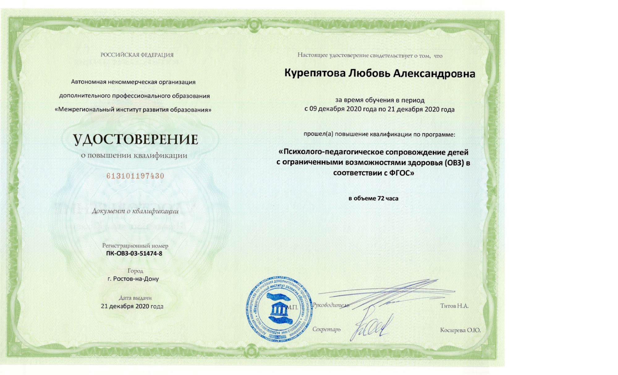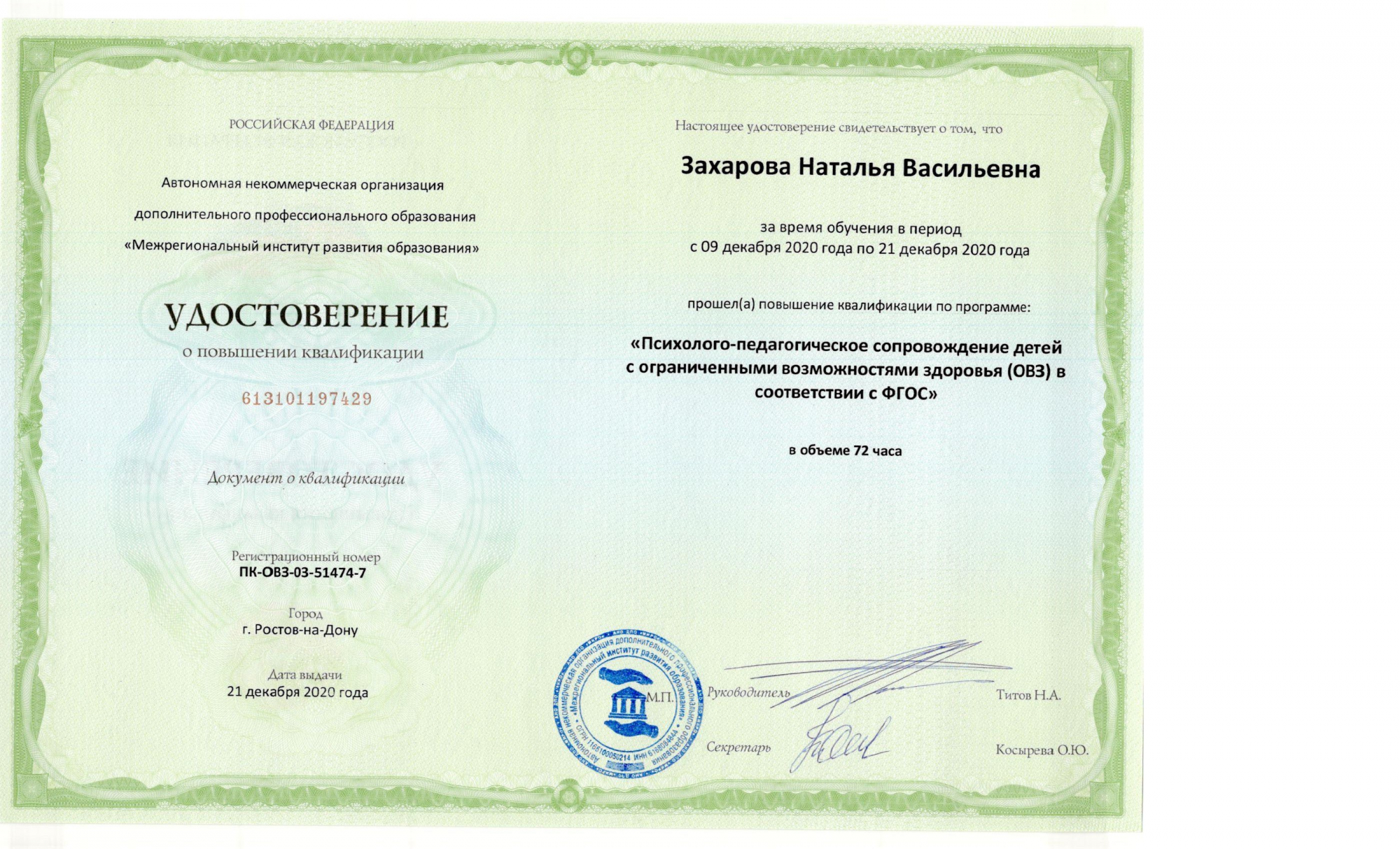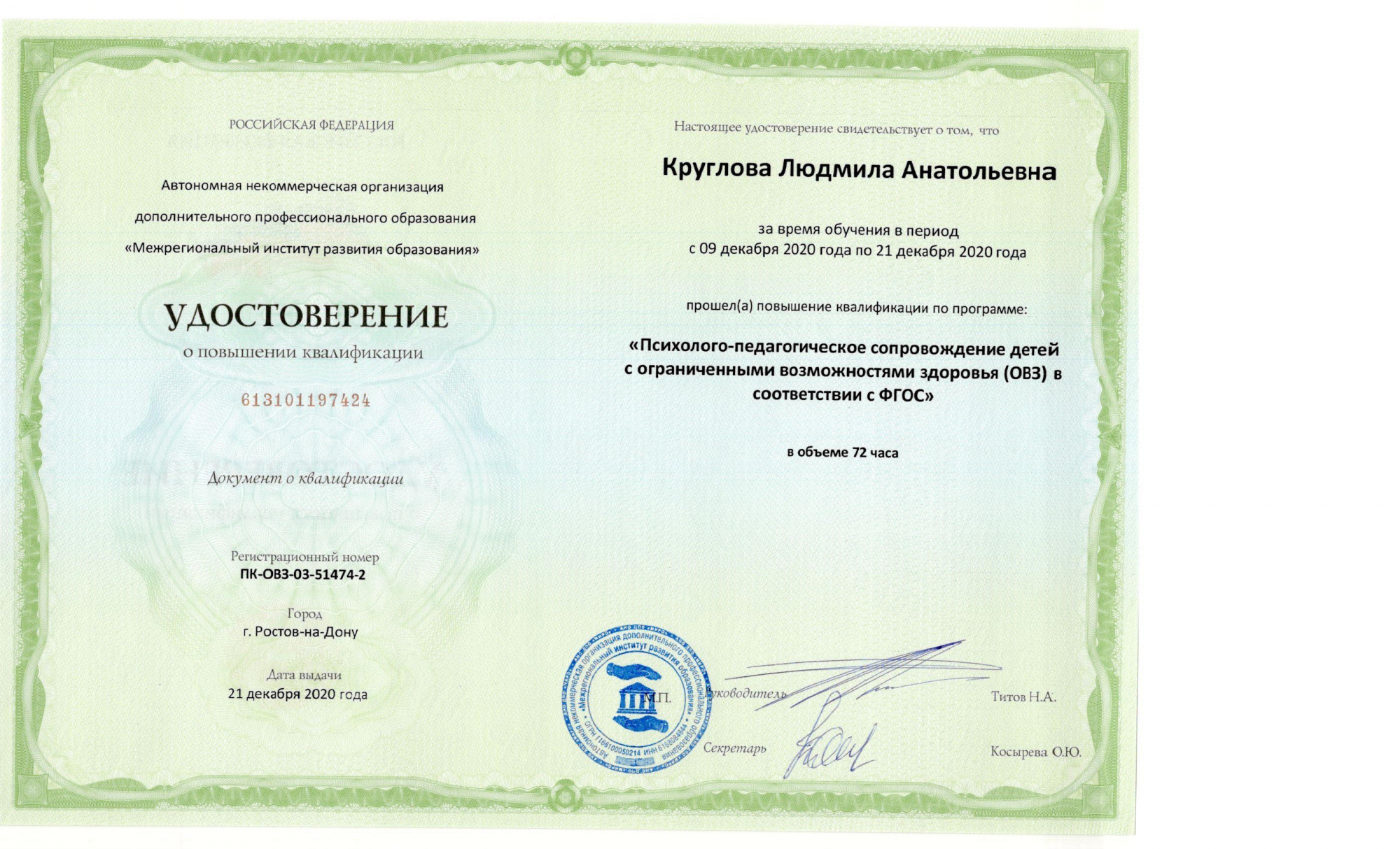 - Удостоверение о прохождении курсовой подготовки педагогов по программе "Психолого-педагогическое сопровождение детей с ОВЗ в соответствии с ФГОС", 2020 г.