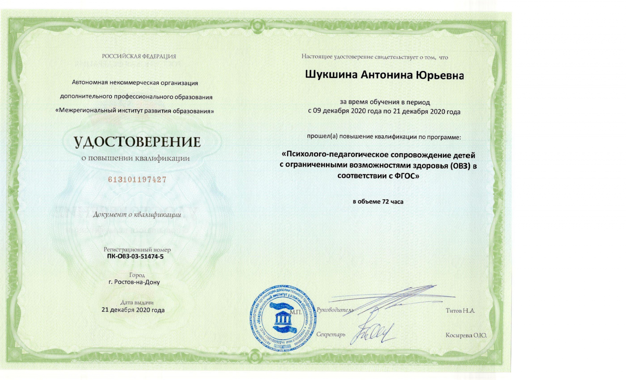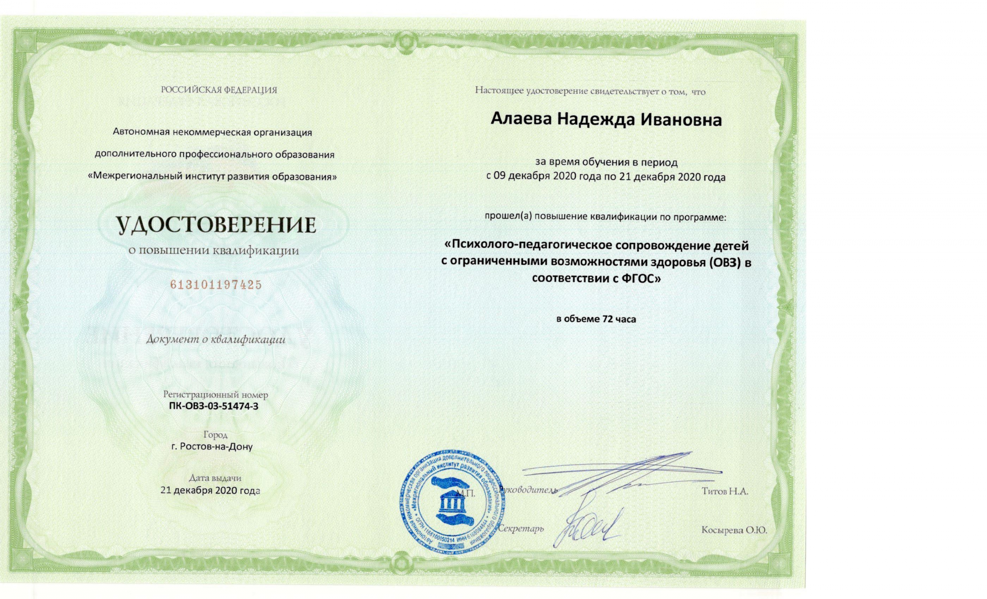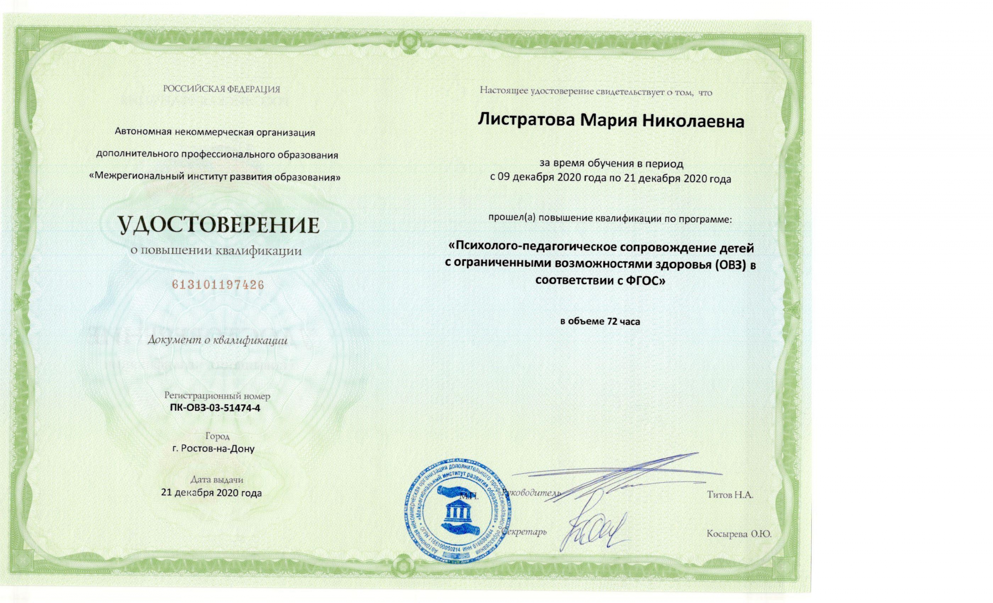 - Удостоверение о прохождении курсовой подготовки педагогов по программе "Психолого-педагогическое сопровождение детей с ОВЗ в соответствии с ФГОС", 2020 г.
