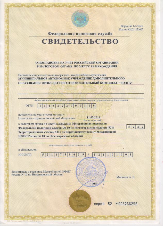 - Свидетельство о постановке на учет в налоговом органе МАУ ДО ФОК Волга