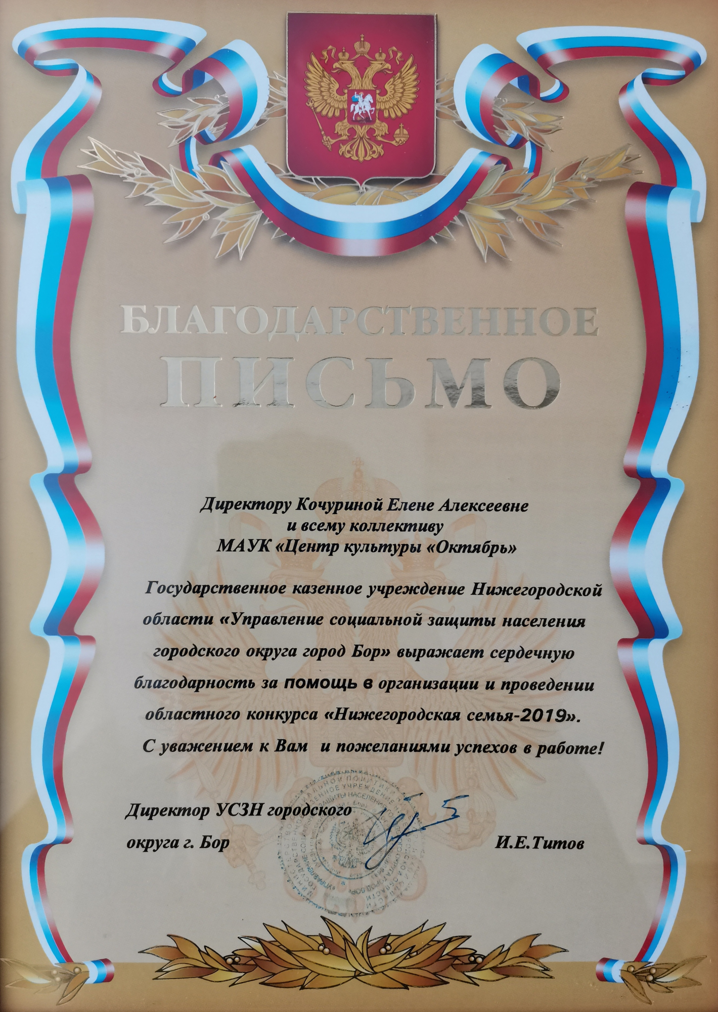 - Благодарственное письмо от Управления социальной защиты населения городского округа г. Бор за помощь в организации и проведении областного конкурса "Нижегородская семья - 2019"