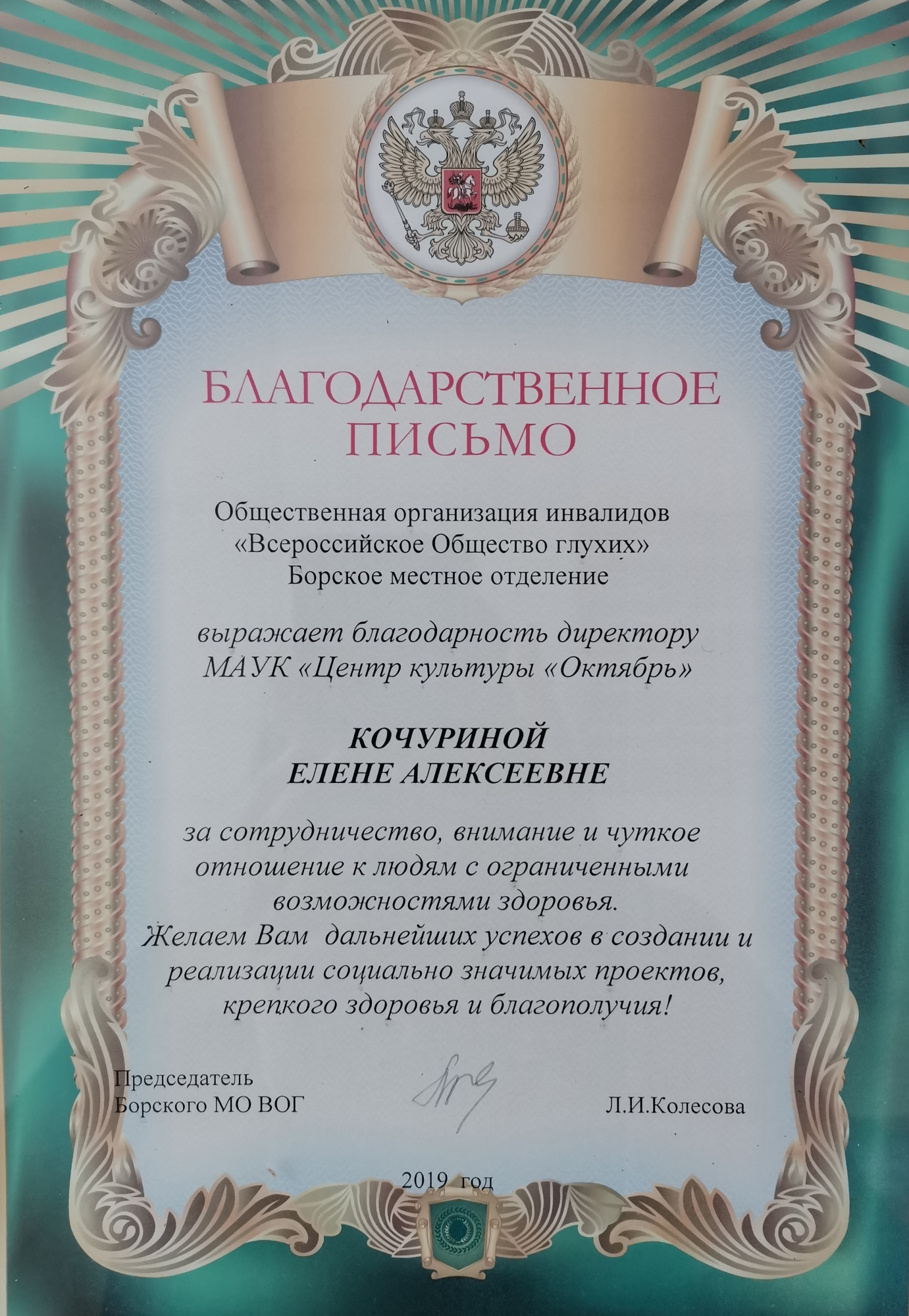 - Благодарственное письмо от Общественной организации инвалидов "Всероссийское Общество глухих" Борское местное отделение за сотрудничество, внимание и чуткое отношение к людям с ограниченными возможностями здоровья
