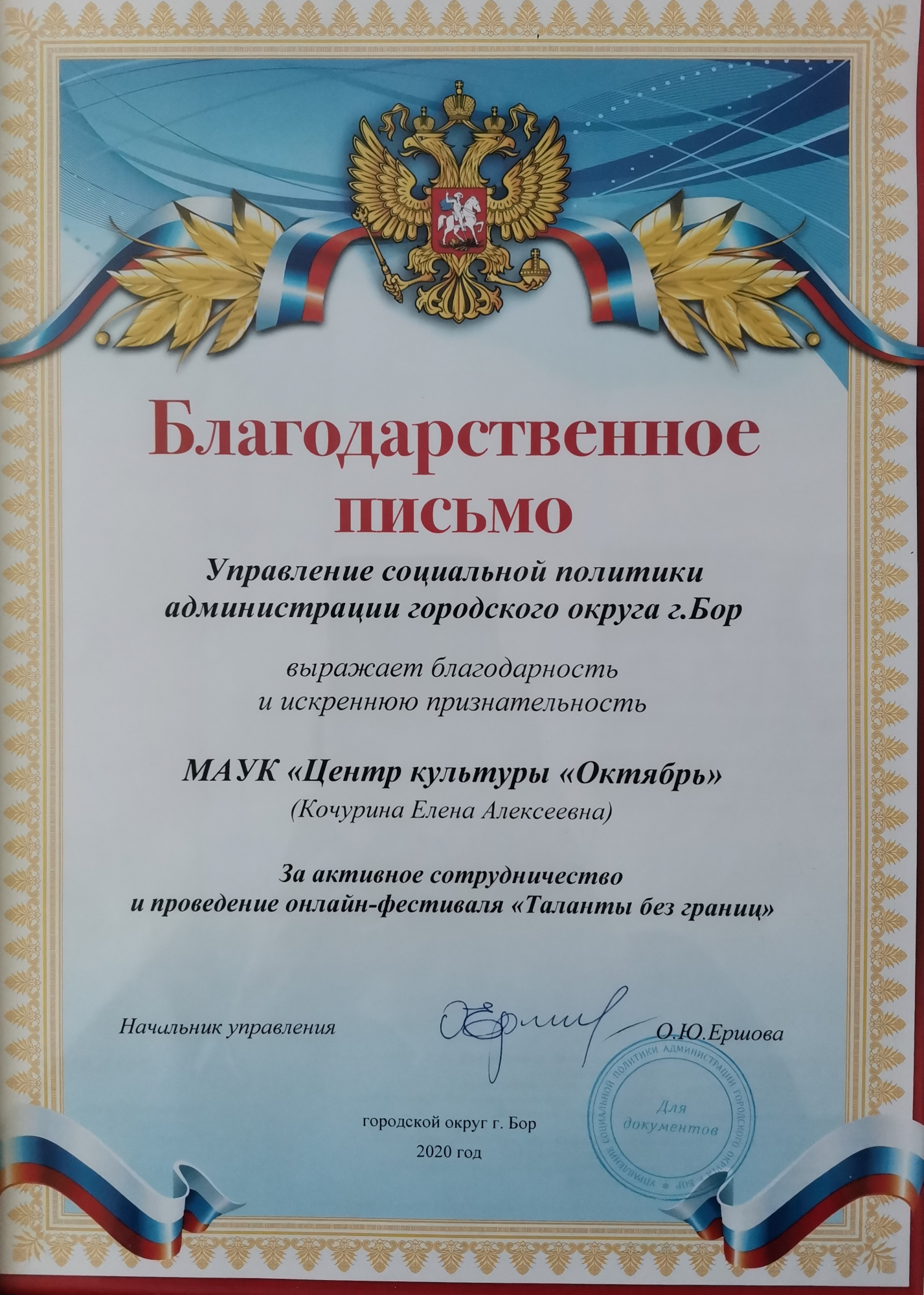 - Благодарственное письмо от Управления социальной политики Администрации городского округа г. Бор за активное сотрудничество и проведение онлайн-фестиваля"Таланты без границ".