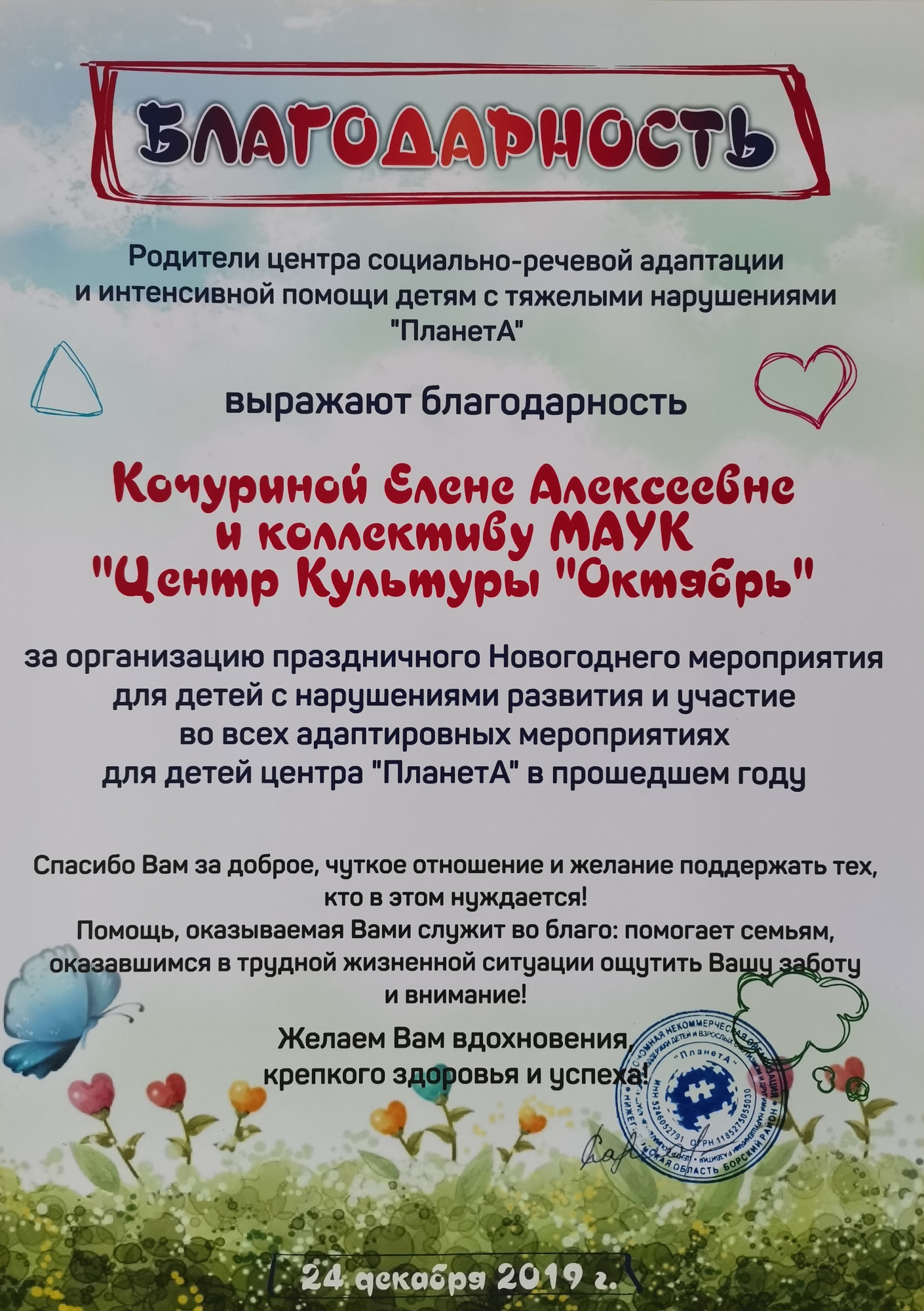 - Благодарность от родителей Центра социально-речевой адаптации и интенсивной помощи детям с тяжёлыми нарушениями "ПланетА" за организацию праздничного новогоднего мероприятия для детей с нарушениями развития
